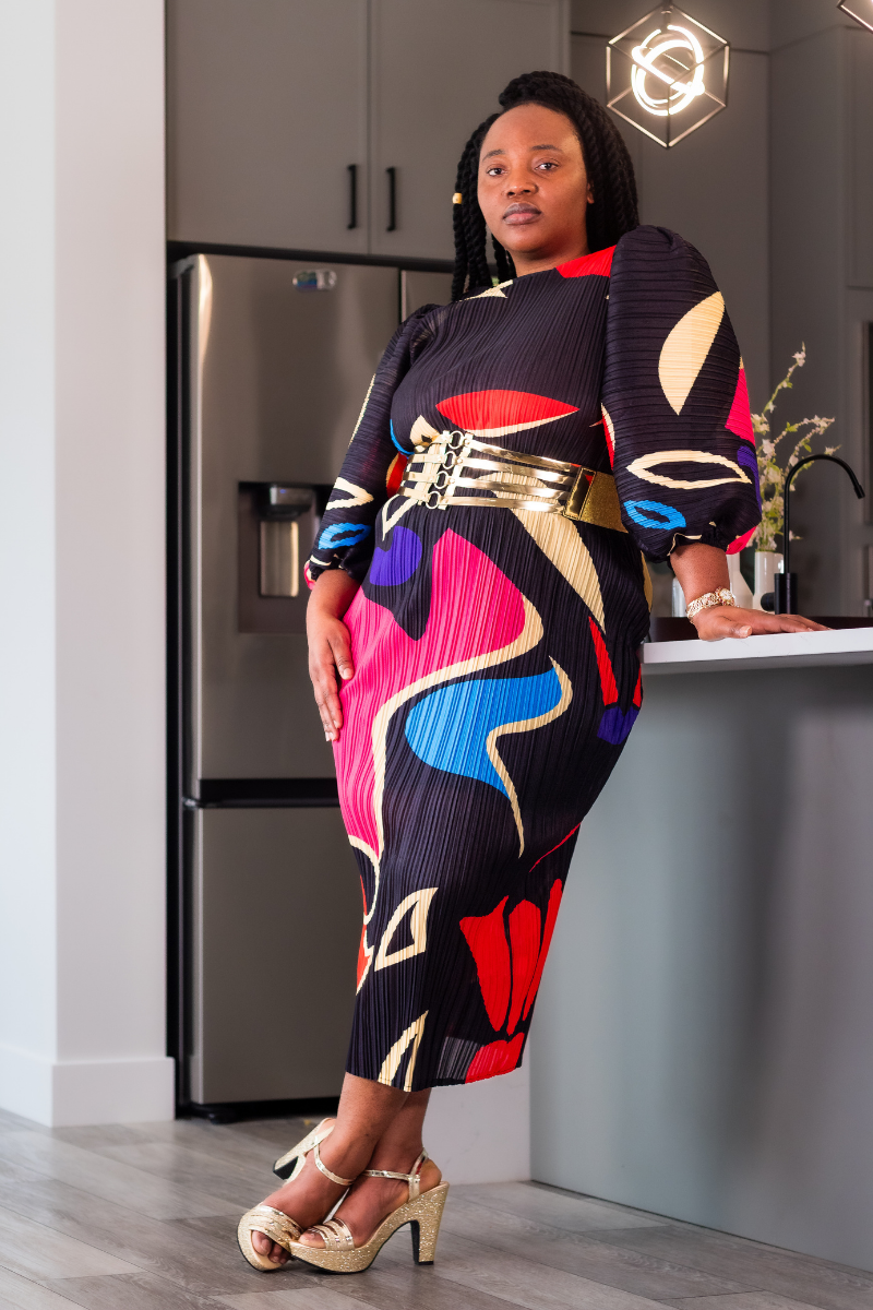 Step into effortless artistry with the Aurora Abstract Midi Dress, a statement piece that blends bold color with fluid design. Featuring a sculptural abstract print in vibrant jewel tones, this dress exudes confidence and creativity. The pleated texture creates subtle movement, while the tailored midi silhouette flatters with timeless elegance. Designed with voluminous sleeves and a relaxed fit, it transitions seamlessly from gallery showings to evening soirées—wherever you want to make an impression.