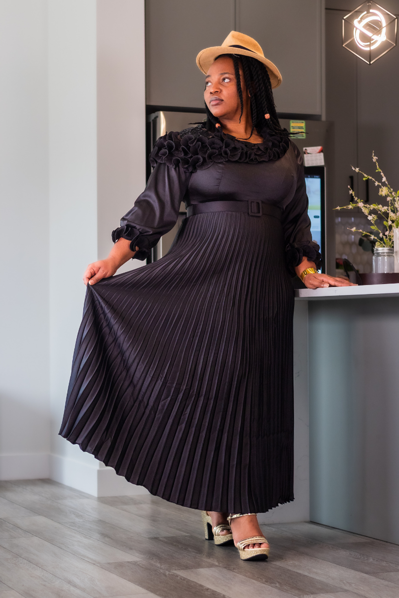 Sophisticated, fluid, and undeniably elegant, the Seraphine Satin Pleat Dress is a statement of timeless femininity. Crafted with a soft satin finish, this full-length silhouette pairs a sculpted belted waist with flowing accordion pleats for graceful movement. The neckline and sleeves are adorned with delicate ruffle appliqué, adding romantic texture to its refined black canvas. Whether for an evening soirée, a formal celebration, or an elevated day-to-night ensemble, this gown makes every entrance unforgettable.
