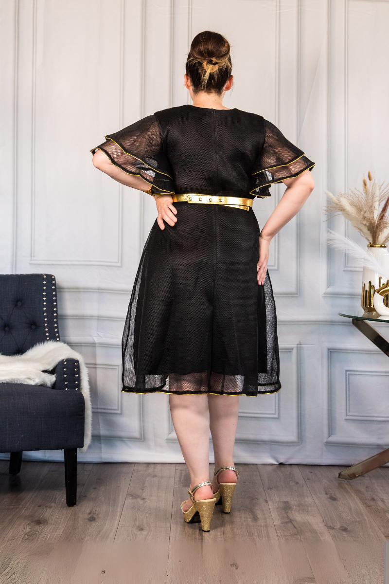 The Liora Royale Midi Dress is a timeless piece of sophistication, blending regal elegance with modern femininity. Designed with a flattering A-line silhouette, it features layered flutter sleeves trimmed with metallic accents, a delicately embellished neckline, and a sheer hemline that adds a touch of airy grace. Whether in cream or black, this dress exudes refined glamour, making it the perfect ensemble for evening soirées, formal gatherings, or any occasion where effortless elegance is a must.