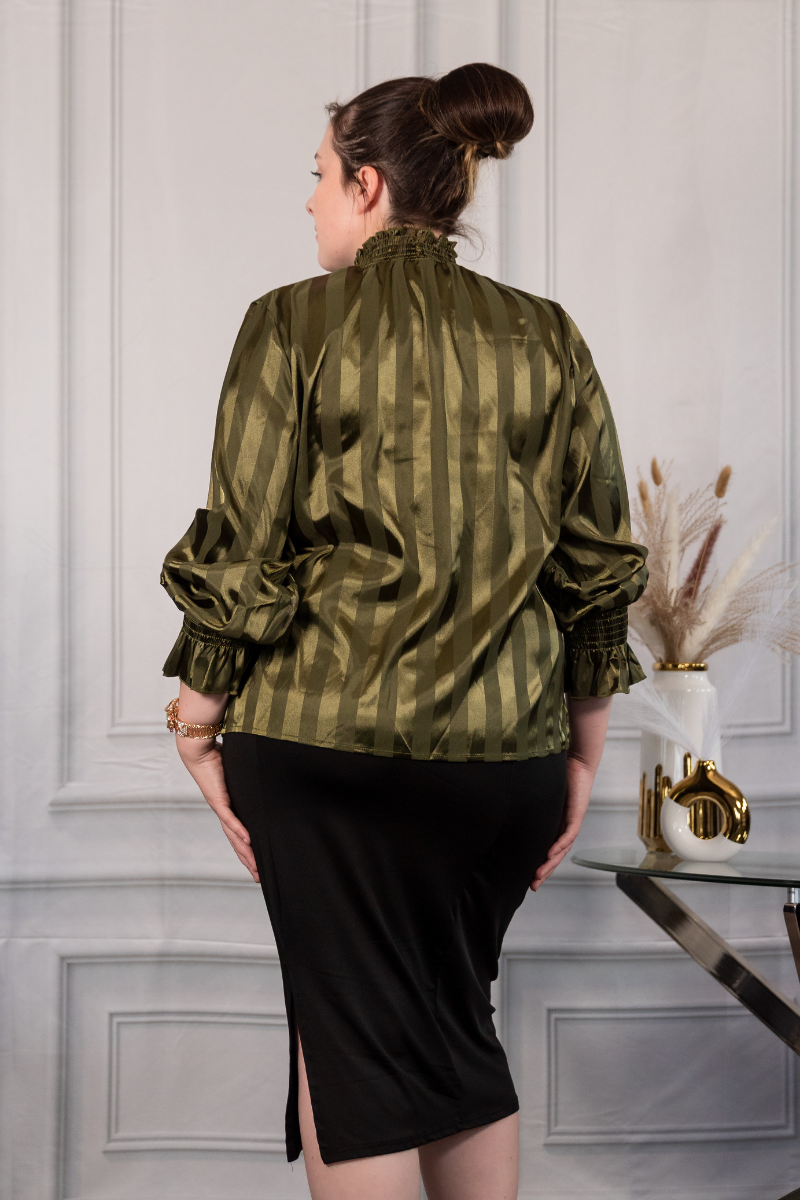 The Olivia Luxe Blouse exudes quiet sophistication with its silky satin finish and tonal vertical stripe design. Featuring a high smocked neckline, gathered cuffs, and subtle ruffle detailing, this blouse balances timeless elegance with modern refinement. Its rich olive hue adds depth and versatility, making it a standout piece for graceful everyday wear or elevated occasions.