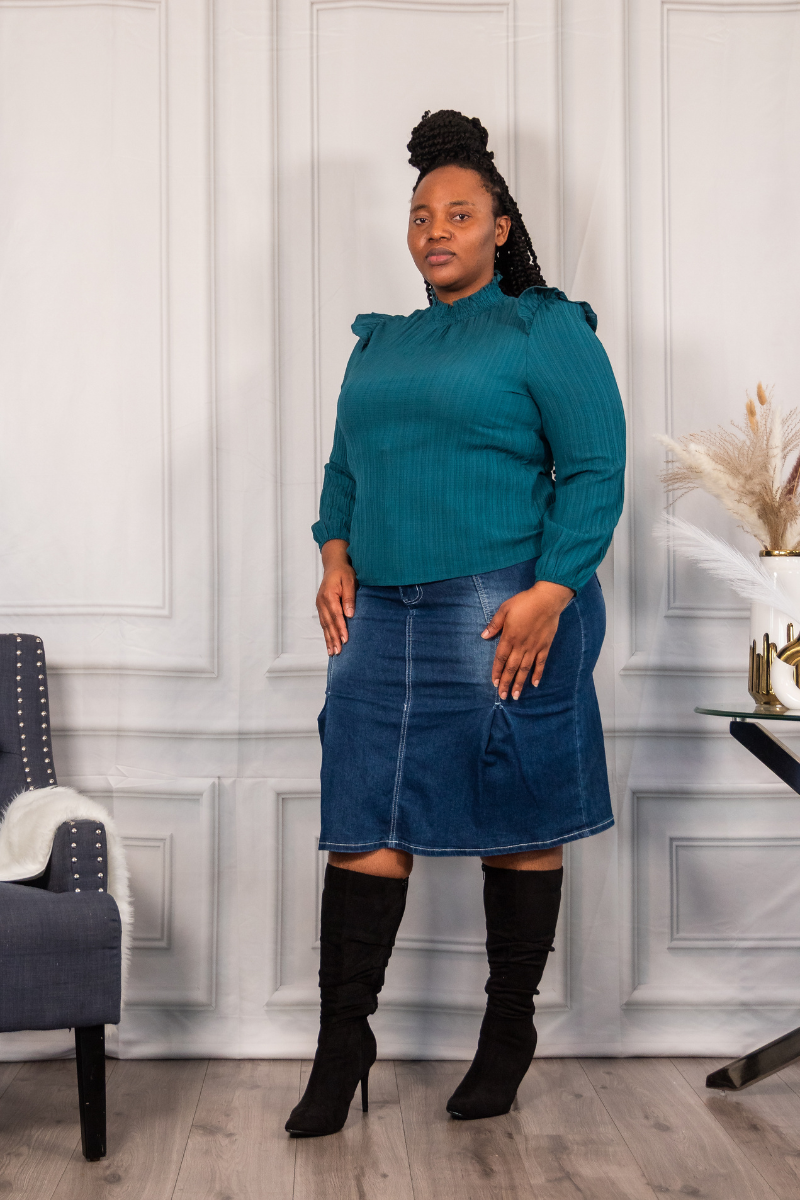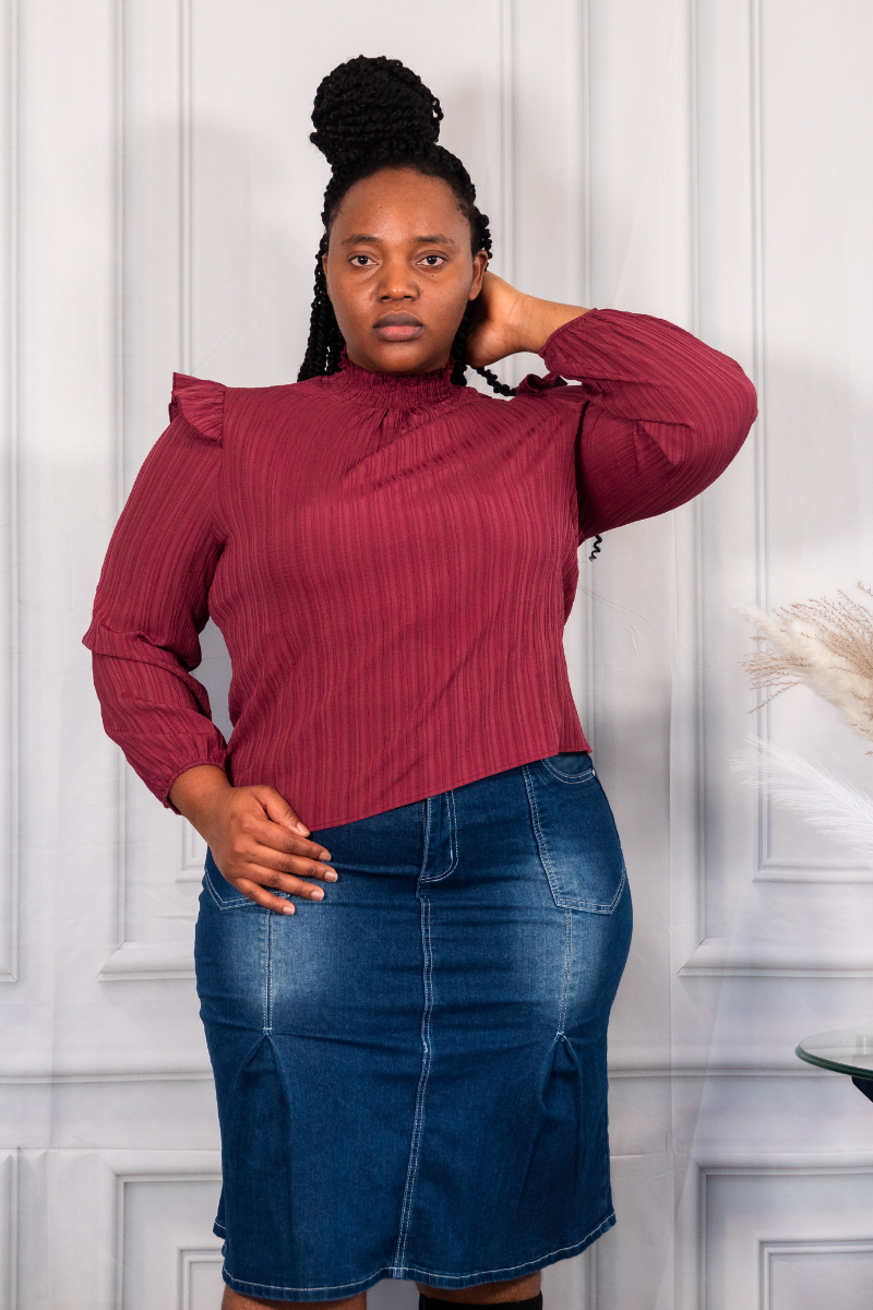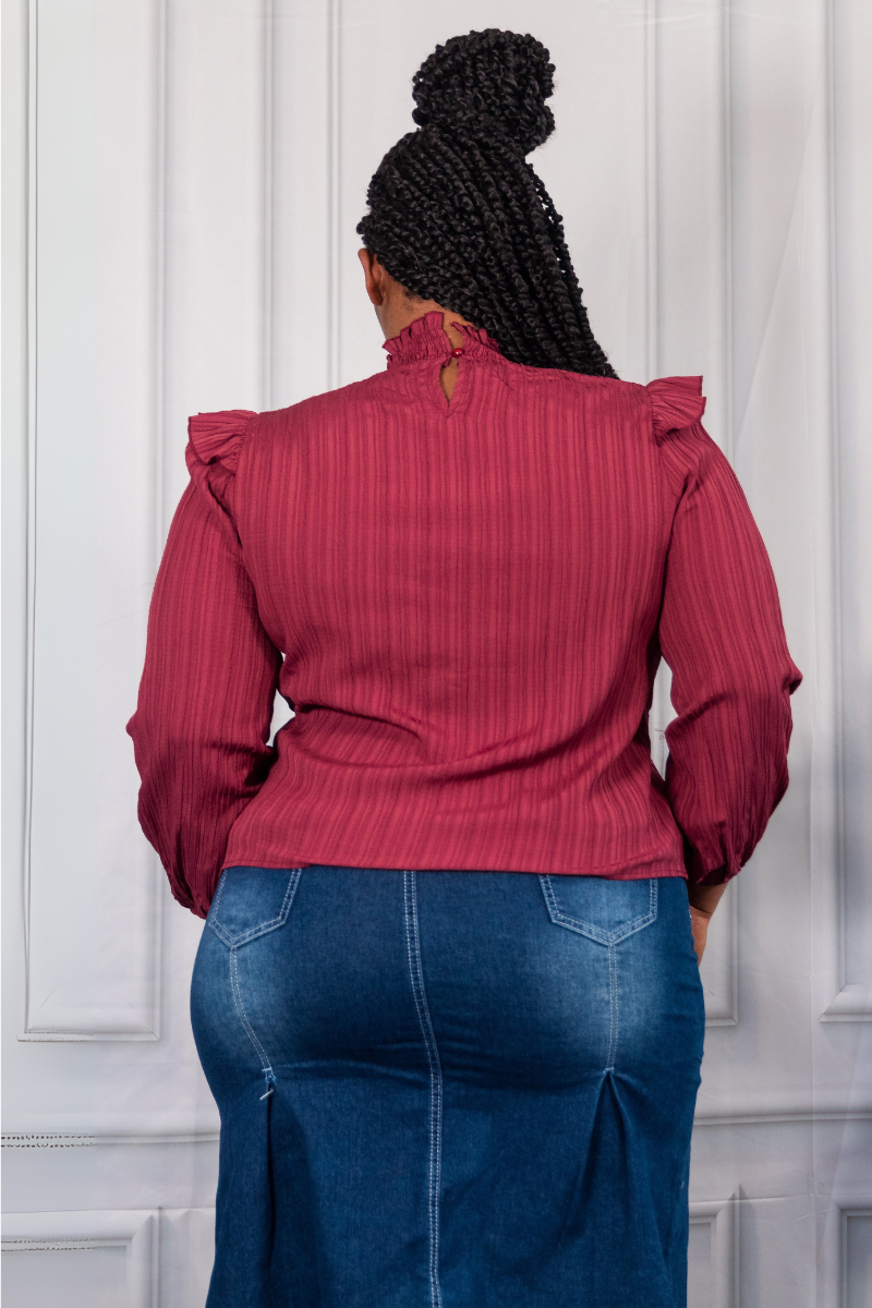 The Sophia Ruffle Blouse is a timeless piece that merges elegance with subtle detailing. Crafted with a textured fabric, it features a high neckline adorned with delicate ruffles and soft shoulder accents that elevate its charm. Its classic silhouette makes it versatile for both workday refinement and evening sophistication. Pair it effortlessly with skirts or denim for a polished yet comfortable look.